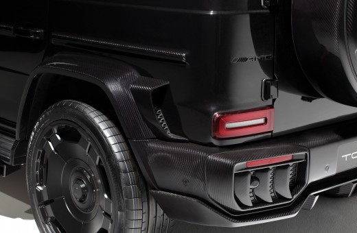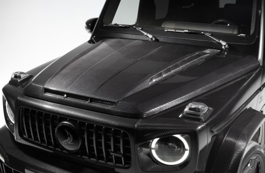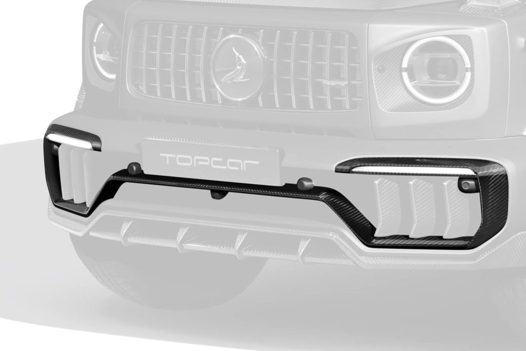 • Central spoiler of the front bumper with frame and inserts for LED lights, visible carbon