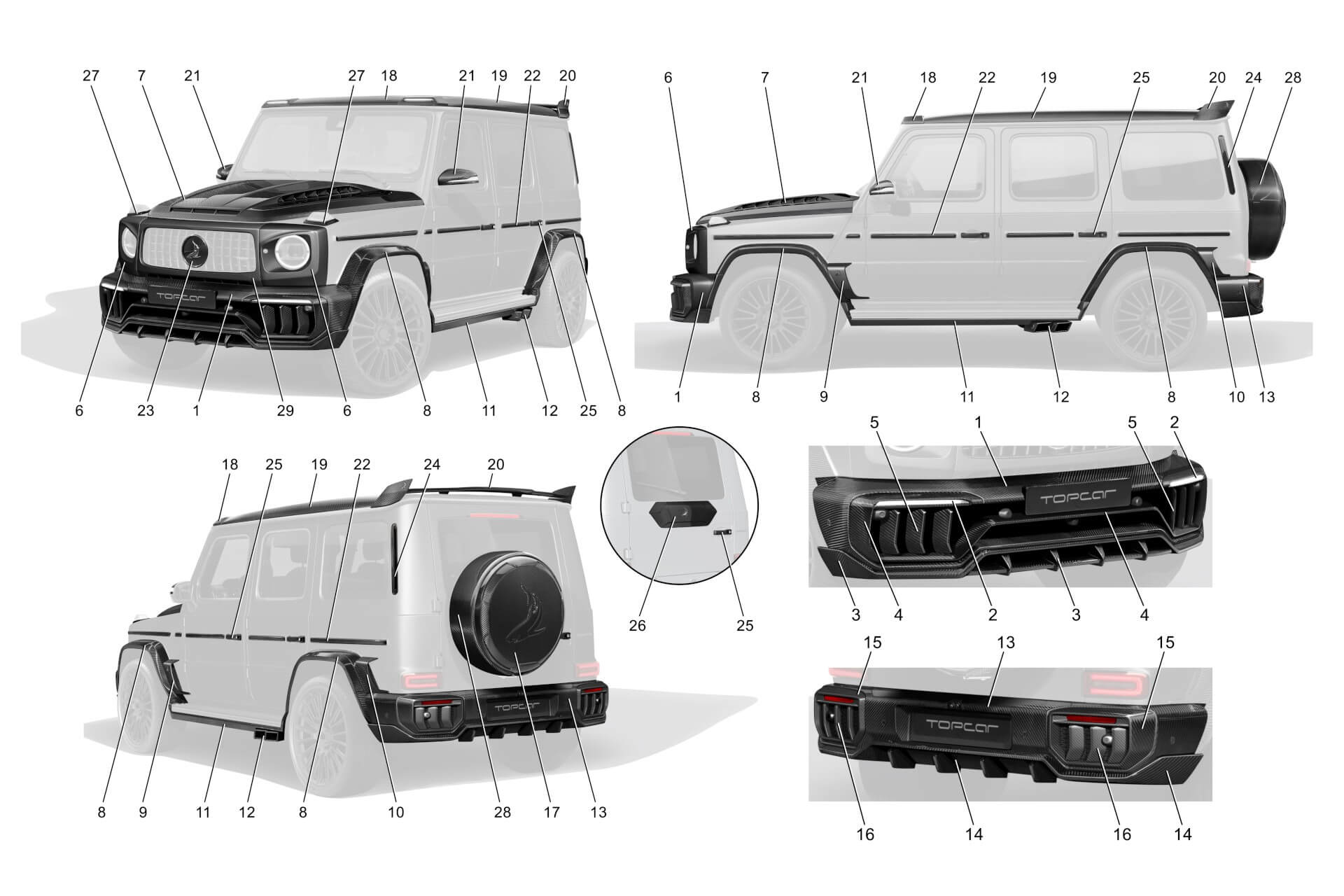 • Front bumper with carbon air intakes and number plate, primed carbon